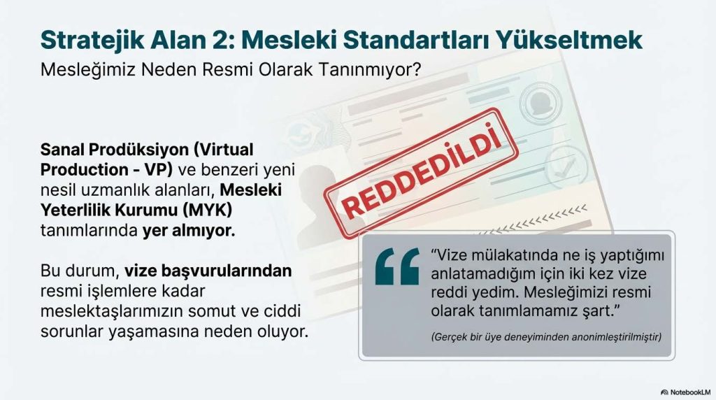 Bu sorunu çözmek için profesyoneller, Mesleki Yeterlilik Kurumu’na (MYK) başvurarak mesleklerini en basit ve anlaşılır dille tanımlamaya çalışıyorlar. Ancak bu süreç de zorluklarla dolu. Mesleğin çok niş olması, resmi bir tanım oluşturmak için gereken minimum kişi sayısına ulaşma riskini de beraberinde getiriyor. Bu noktada, salt bir tanım mücadelesinin ötesinde stratejik bir akıl yürütme devreye giriyor: Madem sıfırdan bir meslek yaratmak için yeterli sayıya ulaşılamıyor, belki de çözüm, sanal prodüksiyonu “3D Generalist” veya “Technical Director” gibi mevcut ve kabul görmüş bir meslek tanımının altında yeni bir uzmanlık dalı olarak konumlandırmaktır.